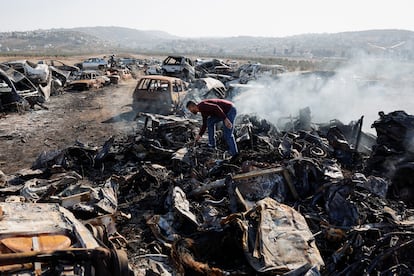 Un palestino inspecciona los coches incendiados por colonos israelíes en la víspera, el pasado día 21 en la localidad cisjordana de Huwara.Ammar Awad (REUTERS)