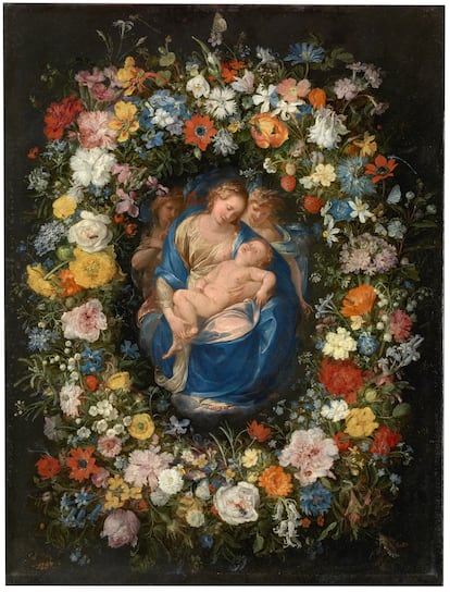 Docenas y docenas de especies de flores llenan ‘Guirnalda con la Virgen, el Niño y dos ángeles’, obra de Jan Brueghel el Viejo en el Museo del Prado.