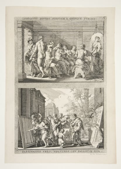 En la parte inferior de esta estampa, el grabador alemán Joachim von Sandrart ilustra el duelo entre Zeuxis y Parrasio.Sepia Times (Sepia Times/Universal Images Group via Getty Images)
