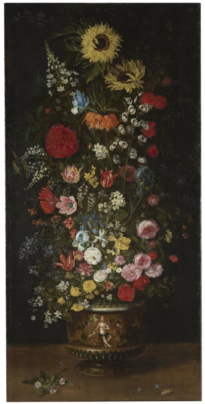 Los dos girasoles que coronan este cuadro titulado ‘Florero’, en el Museo del Prado, muestran la viveza y naturalidad con la que Jan Brueghel retrataba las flores