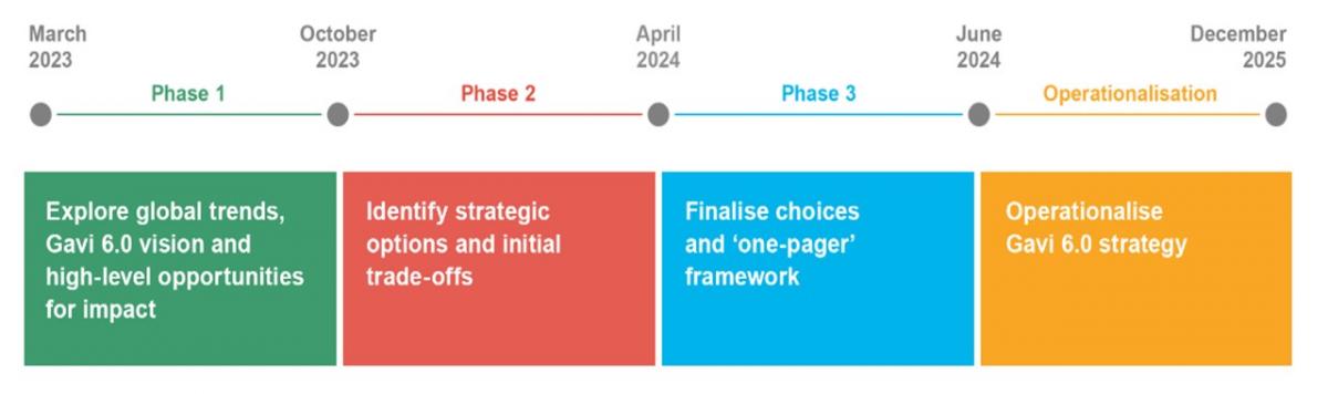 Fase 3: Opciones finales y marco: en abril de 2024, la Junta Directiva de Gavi discutió y tomó decisiones estratégicas basándose en el impacto sanitario estimado y los costos. Estas opciones se consolidaron en el marco final, y en junio de 2024, la Junta revisó y aprobó formalmente la estrategia Gavi 6.0