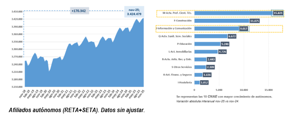 Desde noviembre de 2024, la afiliación de trabajadores por cuenta propia en los sectores de Información y Comunicación y Actividades Profesionales, Científicas y Técnicas se ha incrementado en un 10,5% y 4,7%, respectivamente.
