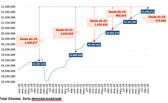 El mercado laboral suma 522.771 afiliados en los últimos doce meses, hasta registrar un total de 21.825.233 ocupados en la serie original en noviembre, el nivel más elevado en ese mes. Supone un ritmo de creación de empleo del 2,5% interanual.