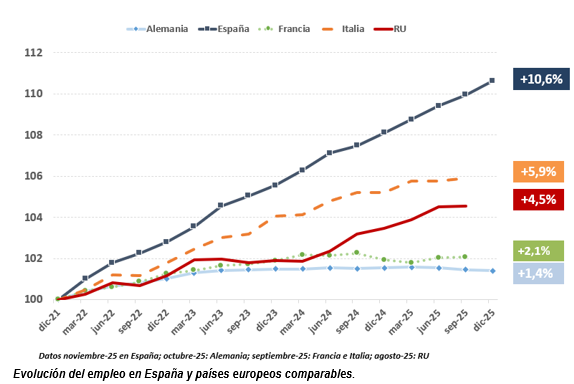 El mercado de trabajo en España (+10,6%) sigue marcando un ritmo de crecimiento superior al de otras economías europeas (Italia, +5,9%; Francia, +2,1%; Alemania, +1,4%), con referencia a datos de finales de 2021, antes de la entrada en vigor de la reforma laboral.