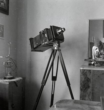 ‘Il banco ottico di Sisto Sisti e l’autore riflesso nello specchio’ (1938/39), de la serie ‘Ritratti’, de Sisto Sisti. Sisto Sisti (Fototeca dell’Archivio provinciale di Bolzano
