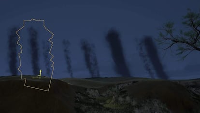 ‘AlMain_1’ (2015). Reconstrucción digital realizada por Forensic Architecture de las casas de al-Ma’in envueltas en humo, según la descripción de Salman Abu Sitta sobre lo que presenció la noche del 13 de mayo de 1948, cuando una milicia sionista atacó y despobló el pueblo de su familia. De ‘Return to al-Ma’in’. Forensic Architecture