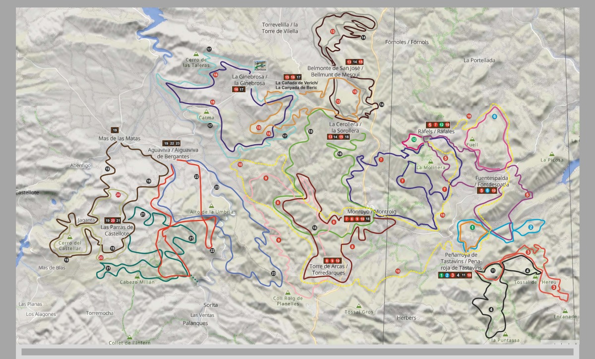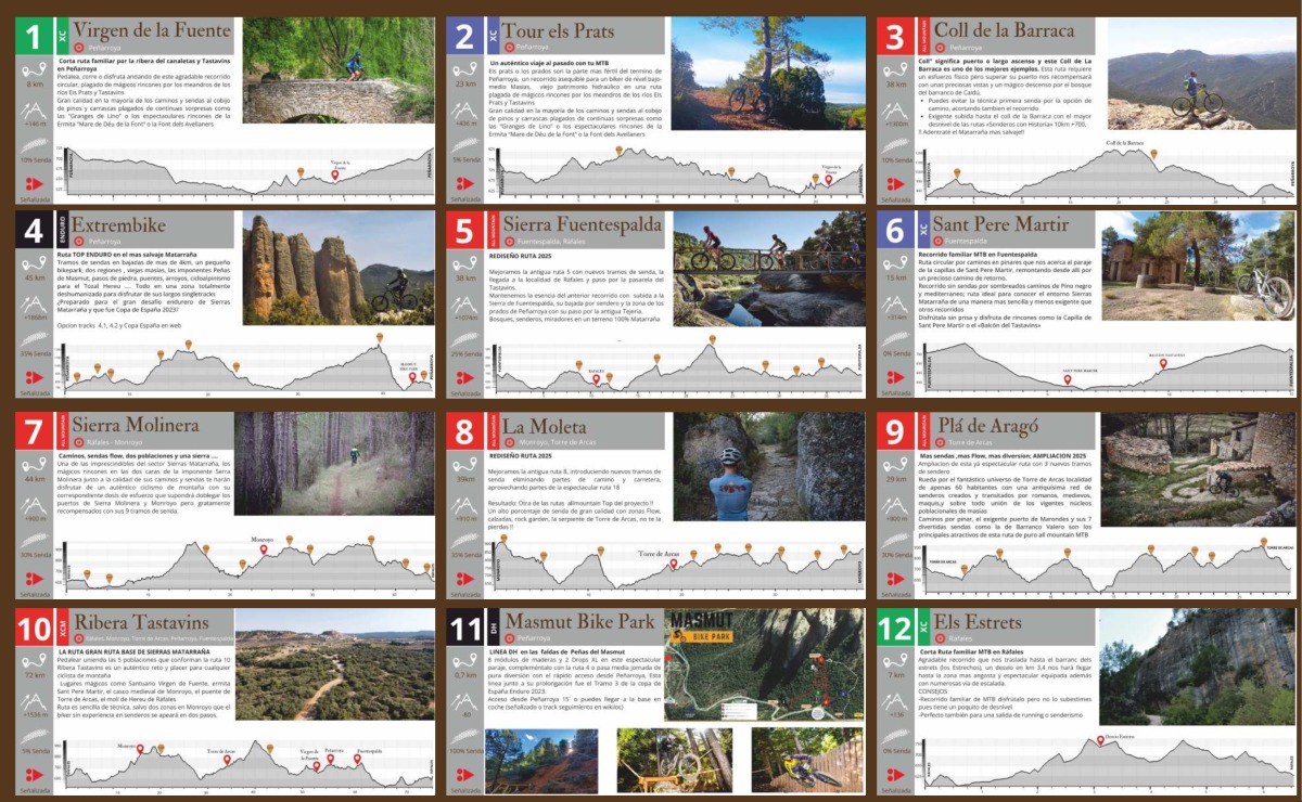 23 rutas se encuentran balizadas y además se complementan con decenas de tracks donde aparecen las míticas pruebas de Copa de España XCM y Enduro desarrolladas en el sector de Sierra Matarraña.