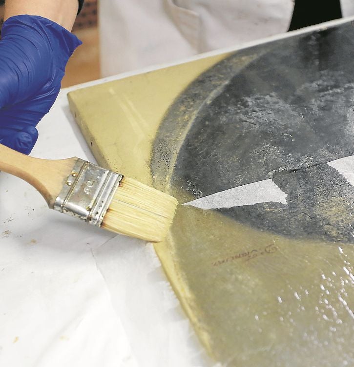 Laura Rodríguez Noval procede a empapelar con papel japonés uno de los retratos para proteger la policromía. : fotos de paloma ucha