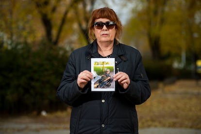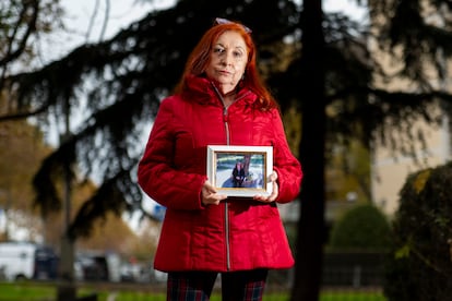 Teresa López sujeta la foto de su hermana, Antonia, muerta en una residencia madrileña durante la pandemia, este domingo en Madrid. JUAN BARBOSA
