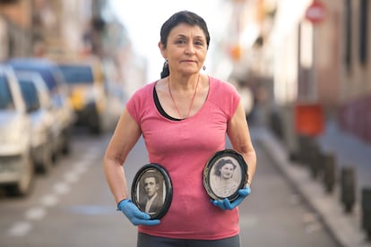 Elena Valero sostiene los retratos de su padre Alfonso que falleció en la residencia DomusVi Usera, y de su madre Benita Pablos, que sobrevivió en ese mismo centro, en una foto de 2020.