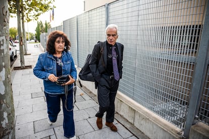 Carmen López, portavoz de Marea de Residencias, y Carlos Vila, abogado del grupo, antes de entrar el miércoles 22 de octubre a los Juzgados de Navalcarnero, en el suroeste de la región de Madrid. SAMUEL SÁNCHEZ
