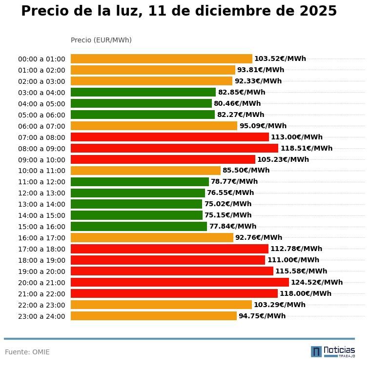 Precio de la luz por horas, 11 de diciembre de 2025