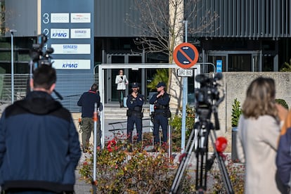 Agentes de la Policía Nacional en la sede de Plus Ultra en Madrid, este jueves. FERNANDO VILLAR (EFE)