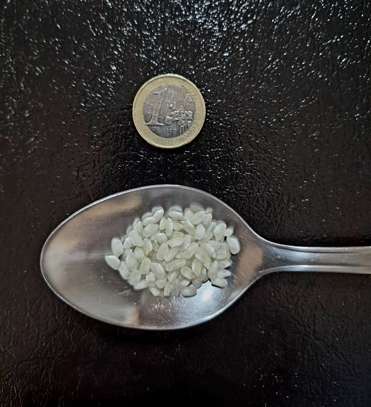 Para hacerse una idea de lo pequeños que son los granos de arroz típicos para hacer paella, cuente 100 granos y colóquelos en una cuchara sopera. Verá que queda mucho espacio disponible. Hagamos una estimación de lo que pesan cien mil granos de arroz. En los artículos científicos sobre la agronomía del arroz, se suele usar como medida de peso una unidad llamada PMG (peso de mil granos ).