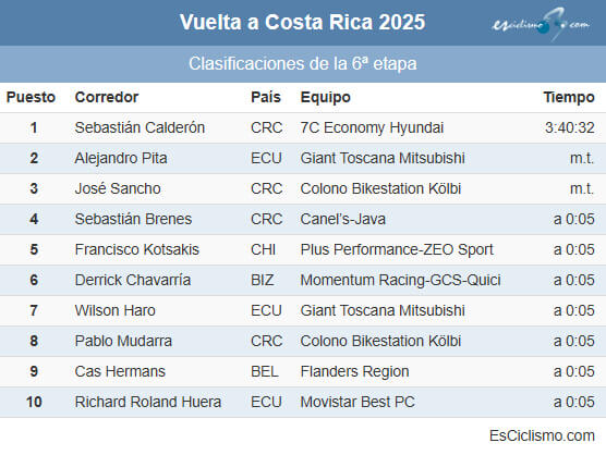 Éstas son las clasificaciones completas tras la 6ª etapa de la Vuelta Ciclista Internacional a Costa Rica 2025, una jornada llana de 166,1 kilómetros disputada este miércoles, 17 de diciembre, entre Pérez Zeledón y Ciudad Neilly, marcada por una numerosa escapada y por la posterior decisión del jurado técnico en el sprint final.