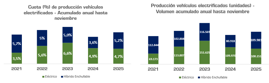 Hasta el penúltimo mes de 2025, se han acumulado un total de 825.787 vehículos alternativos, lo que supone un aumento del 26,7% con respecto al mismo periodo de 2024 y una cuota del 38,8% de la producción total.