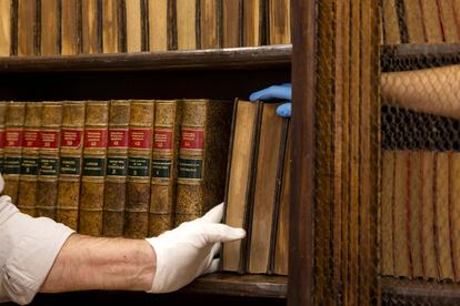 En ‘Páginas y Guantes sucios’ (2025), del artista Ignasi Aballí, los libros de la Casa Cervantes de Valladolid se han girado para mostrar las hojas, en vez del lomo.Víctor Hugo Martín ( Museo Casa de Cervantes )