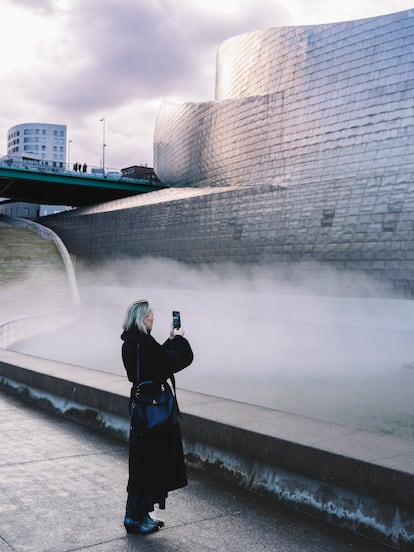 El fotógrafo le pide que suba las escaleras que unen Zubizuri con las colosales torres de 23 plantas del japonés Arata Isozaki, y después la sigue con su cámara por la Alameda de Mazarredo, en el borde de la margen izquierda de la ría. De pronto, ya junto al museo, una niebla repentina empieza a envolver la parte baja del edificio. Ahora es ella quien saca la cámara (del móvil) y se pone a disparar. No es niebla espontánea ni natural, sino la que protagoniza Escultura de niebla nº 08025 (F.O.G.), obra de la artista japonesa Fujiko Nakaya, regalo del fallecido artista estadounidense Robert Rauschenberg al Guggenheim. Miren Arzalluz se guarda el móvil, reemprende la marcha y entra en el edificio. Empieza su jornada de trabajo.