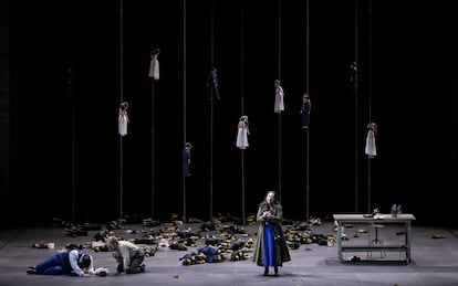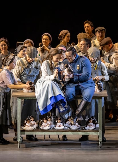 La soprano Mariangela Sicilia (Luisa) y el tenor Freddie De Tommaso (Rodolfo) junto a varios integrantes del Cor de la Generalitat Valenciana en el primer acto de ‘Luisa Miller’, el 10 de diciembre en Les Arts.© Miguel Lorenzo – Mikel Ponce (© Miguel Lorenzo – Mikel Ponce)