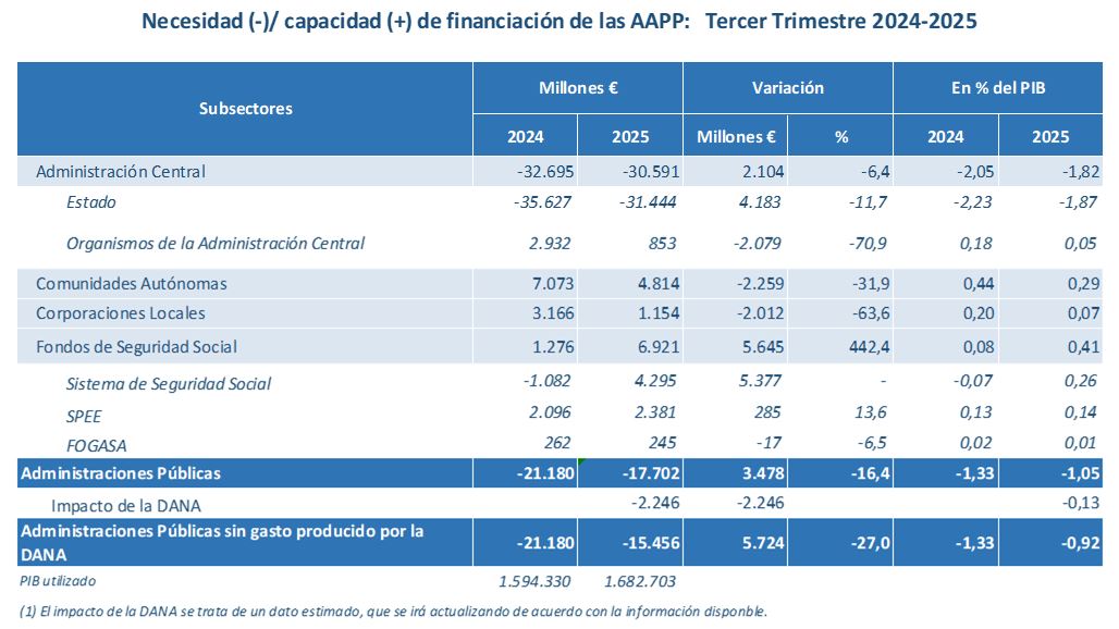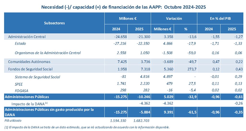 Hasta el décimo mes de 2025, el déficit conjunto de la Administración Central, los Fondos de la Seguridad Social y las Comunidades Autónomas se sitúa en 10.246 millones, equivalente al 0,61% del PIB. Si se excluye el impacto por la DANA de 4.362 millones, el déficit se sitúa en 5.884 millones de euros. Es decir, sin tener en cuenta este impacto el déficit se reduce en un 61,5% hasta el 0,35% del PIB.