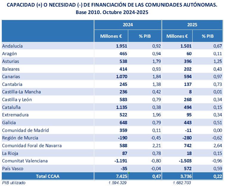 La Administración Regional registra un superávit a finales de octubre de 2025 de 3.736 millones de euros, lo que equivale al 0,22% del PIB.