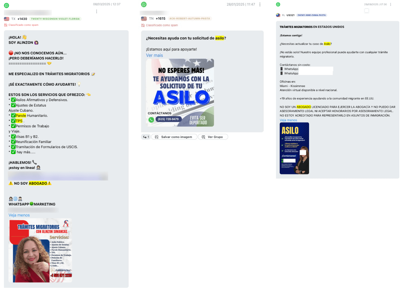 “Especialistas” que ofrecen caminos para obtener un estatus legal. La investigación detectó mensajes de personas que se describen como “especialistas” o “consultores” y ofrecen atajos para obtener una residencia permanente, permisos de trabajo, asilo e, incluso, la ciudadanía. En los mensajes advierten: “No soy abogado”.