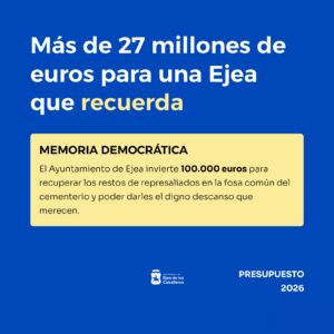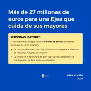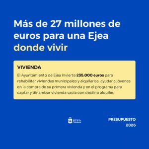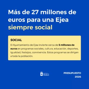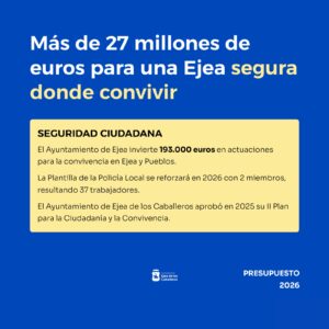El Presupuesto para el ejercicio 2025, cuyo anexo de inversiones supone cerca del 25 por ciento, contempla un significativo gasto en políticas sociales y en políticas para impulsar la actividad económica del municipio, además de destacadas actuaciones que vertebrarán la acción del equipo de gobierno en los próximos meses. Estas actuaciones, que responden a las necesidades concretas de los vecinos de Ejea y Pueblos, pertenecen a los ámbitos de la seguridad, el acceso a la vivienda, la convivencia ciudadana, la limpieza viaria y el bienestar de las personas mayores, entre otros.