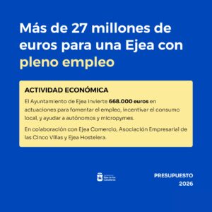 El Pleno del Ayuntamiento de Ejea de los Caballeros ha celebrado su última sesión del año 2025, en la que se ha aprobado el Presupuesto para el año 2026. El Presupuesto, que asciende a 27.671.543 euros, ha sido aprobado con los votos a favor del equipo de gobierno PSOE-IU, y los votos en contra de PP, AsiEjea, Ciudadanos y Vox.