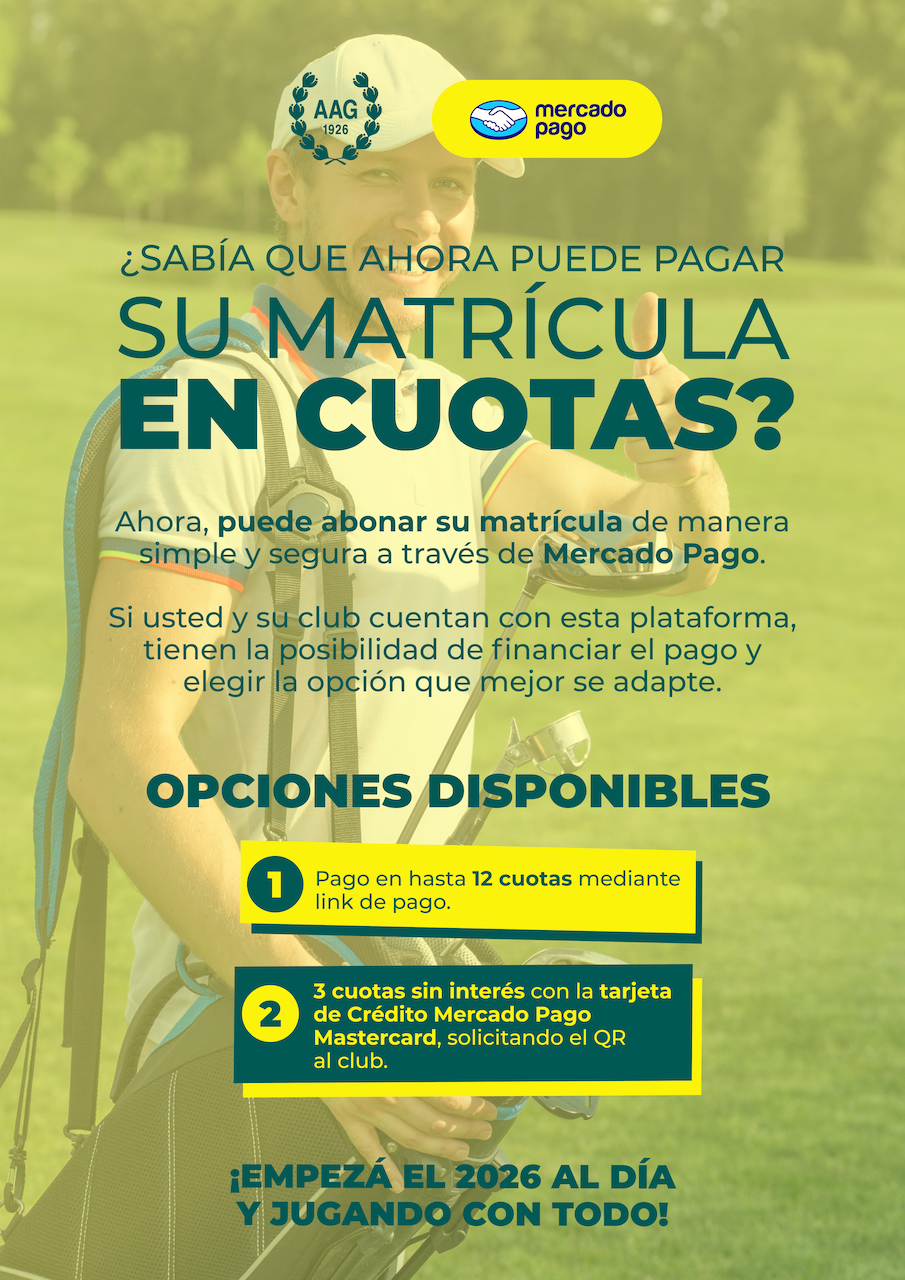La Asociación Argentina de Golf informa la incorporación de nuevas alternativas de pago para la Matrícula AAG. A partir de ahora, el trámite puede realizarse a través de la aplicación Mercado Pago, con distintas opciones de financiación disponibles según el medio de pago elegido. Ingrese al anuncio para más información.