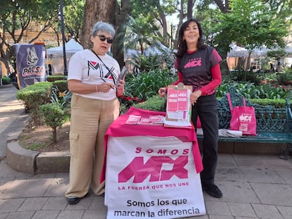“Hola, ¿usted cómo cree que está el país?”, es la pregunta con la que Nelly Valladares se acerca a los transeúntes en el centro de Tlalpan, una alcaldía al sur de la Ciudad de México. La mujer ha instalado un pequeño módulo cerca del kiosco y reparte folletos acompañada de su amiga Diana Escalante. Viste una camiseta negra con vivos en color rosa y el logotipo de Somos Mx, una organización opositora que busca convertirse en partido político nacional.