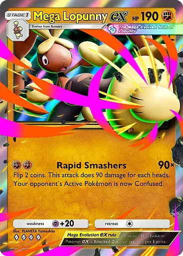 La fortaleza de Mega Lopunny ex está en su ataque, que por solo dos energías tipo Lucha puede lanzar dos monedas, e infligir 90 puntos de daño por cada cara que salga. Esto significa que puede hacer 0, 90 o 180 puntos de daño.