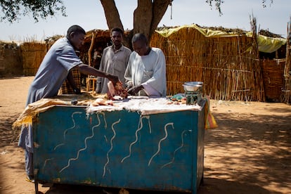 Unos hombres cortan carne en un puesto de comida improvisado del asentamiento informal de Adré, en Chad.Lola Hierro