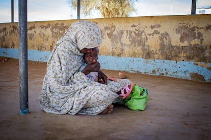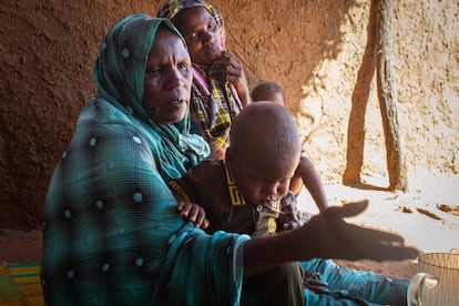 Ashaa Abdalla conversa mientras sostiene a su nieto Moutassim en sus brazos, en el campo de refugiados de Farchana (Chad) en diciembre de 2025.Lola Hierro
