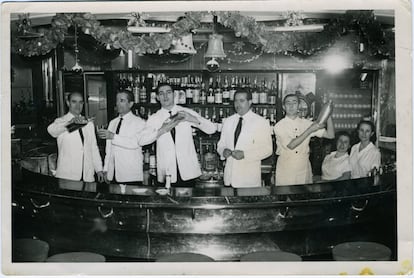 Celebrando las navidades en el bar americano del edificio Capitol. Memoria de Madrid. Imagen compartida por Alberto Herreros Castillo.La democratización y el ‘pop’ culinario