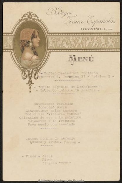 Menú servido en el Buffet italiano de Madrid en las navidades de 1924. Biblioteca Nacional de España