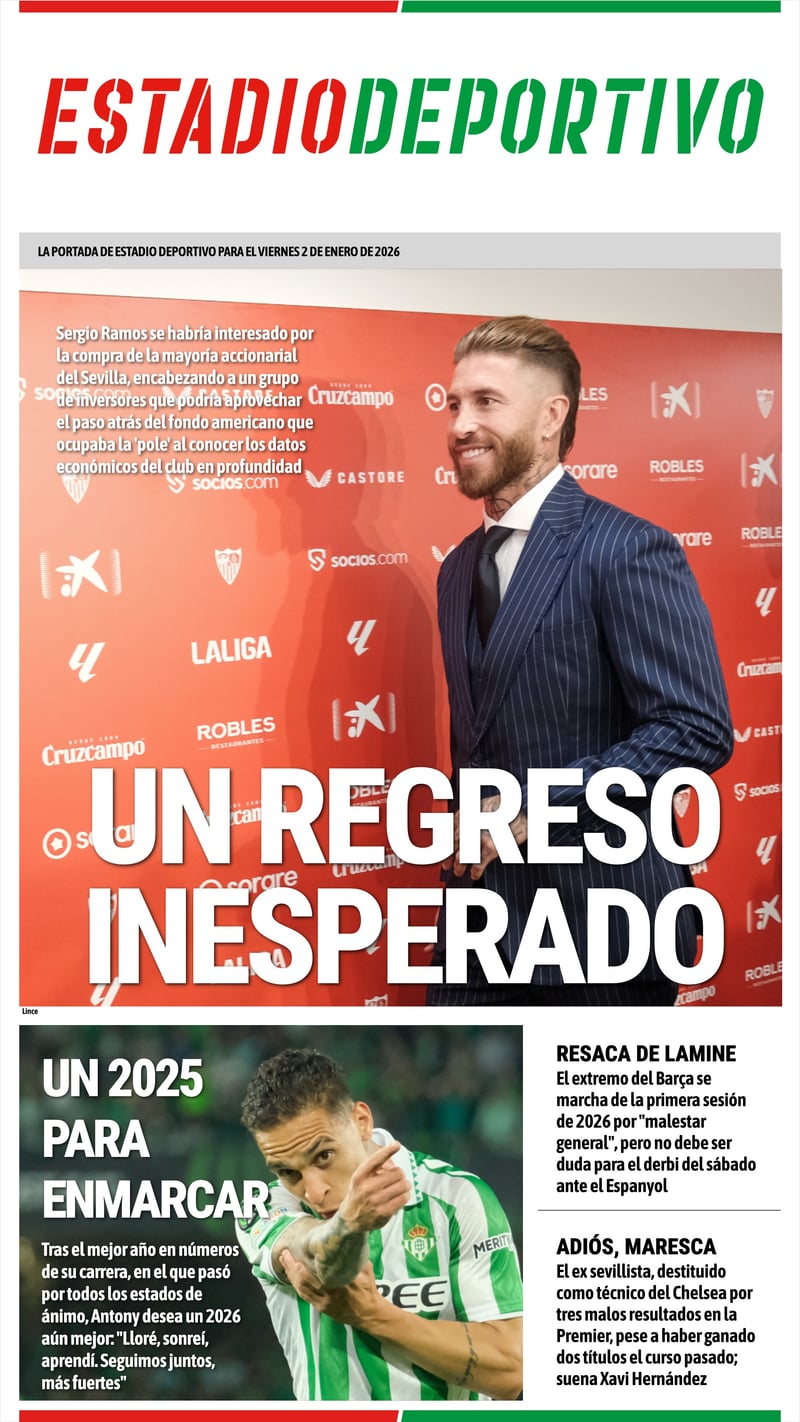 La portada de ESTADIO Deportivo para el viernes 2 de enero de 2026: