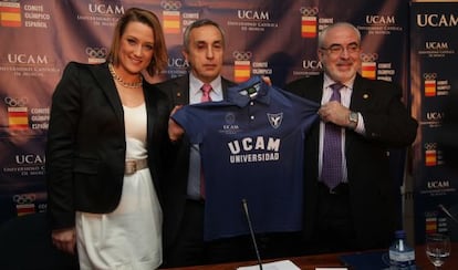 La nadadora Mireia Belmonte, junto a Alejandro Blanco y José Luis Mendoza, en 2013.SANTI BURGOS