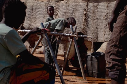 Unos niños se abastecen de agua en un grifo a pocos metros de la frontera entre Chad y Sudán, en diciembre de 2025.Lola Hierro