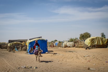 Una mujer subida en burro en el asentamiento espontáneo de Adré.Lola Hierro