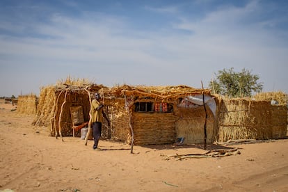 Un hombre saluda desde su tienda, construida con ramas y cañas, en el sitio espontáneo de Adré, en el este de Chad, en diciembre de 2025.Lola Hierro