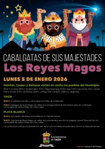 Las cabalgatas serán el lunes 5 de enero a las 17:00 h en Yaiza y a las 19:30 h en Playa Blanca. Durante la mañana del mismo 5 está previsto un recorrido por los pueblos del municipio.