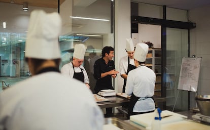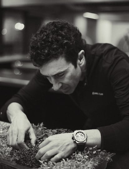 En Azurmendi, el restaurante que Atxa fundó en 2005 y que atesora tres estrellas Michelin desde 2013, la cocina es al menos tan grande como la sala. Lo visitamos una mañana de noviembre. Desde fuera, este imponente pabellón moderno encaramado a una colina de Larrabetzu, a diez minutos del aeropuerto de Bilbao, parece cerrado a cal y canto. Sin embargo, en la cocina, decenas de cocineros se afanan en tareas de distinta intensidad. Hay grandes cazuelas e instrumentos de precisión; fogones profesionales y finas pinzas para sostener con delicadeza las flores, las espumas y las láminas que forman parte de la magia de Azurmendi. Cuenta Atxa que hace tiempo visitó una manufactura relojera y le sorprendió descubrir que no son trabajos tan distintos. “Me imaginaba algo muy tecnológico, y lo es, porque es un trabajo de mucha precisión, pero también es artesanía, porque al final hay un señor ahí, encajando cada pieza con sus deditos, igual que nosotros”. Se refiere a la fábrica de Hublot, la firma con la que colabora desde hace años; una de esas oportunidades solo reservadas a un puñado de estrellas, aunque el término le produce cierto rechazo. “El estrellato no me interesa nada, porque es mentira”, responde. “Las estrellas no existen. Todo el mundo, cuando le das la vuelta y lo sacudes un poco, saca más o menos lo mismo. Todos somos de carne y hueso. Por supuesto, admiro el trabajo de muchísima gente, lo brillantes que son muchísimos compañeros. Pero el halago no me emociona. A mí lo que me gusta es que me quieran. Cuanto más te quieran, mejor”.