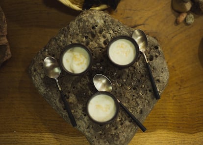 Atxa prefiere hablar de cosas concretas. De sus iniciativas locales para promover el compostaje o la recuperación de la flora autóctona. O de la oveja lacha, la raza de cuyos ejemplares proceden la leche, la nata y los quesos que integran un postre de un minimalismo explosivo. Muchos de sus ingredientes tienen nombre y apellidos, como la cebolla morada de Zalla. Cuando le hablaron de ella, apenas quedaba una agricultora que la producía. “Nos pareció un producto extraordinario, así que lo pusimos en nuestro menú y, durante años, lo incluimos en las recetas que nos pedían los medios de comunicación. Con el tiempo nos dimos cuenta de que no solo estábamos poniendo el valor la recuperación del producto, sino el trabajo de una señora. Ahora ya hay muchos más productores”.