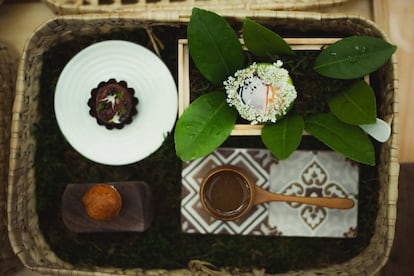 Durante nuestra visita, los comensales están citados con minutos de diferencia para iniciar el recorrido de forma escalonada. En el vestíbulo, un exuberante jardín interior, un picnic de bienvenida inaugura la experiencia con cuatro bocados que son otras tantas detonaciones sensoriales. Es un inicio eufórico, una invitación a bajar la guardia. Después se pasa a la cocina, donde los cocineros saludan con un sonoro “kaixo!” y llega el turno de cuatro platos marineros frescos. En la siguiente estancia domina lo floral. El ritmo es ágil y fluido. Los fuegos artificiales no están en las sofisticadas elaboraciones —que lo son, y mucho—, sino en el paladar. Los nombres de los platos son cortos y las explicaciones del equipo son directas y comprensibles. No hay espacio para el aburrimiento, para la oscuridad retórica ni para la ansiedad. La gastronomía de autor en la que se crio Atxa, la de los cocineros convertidos en gurús conceptuales, abusó de la parafernalia metafísica, pero el vizcaíno ha depurado el lenguaje. Más que a una performance incomprensible, la experiencia de Azurmendi se parece a una obra de teatro o una película. Cada plato genera un interrogante distinto, pero los cliffhangers se resuelven al primer bocado. Ya en la mesa, se suceden cuatro secciones: una dedicada a productos de temporada —en otoño, setas—; otras, a productos de proximidad —con éxitos como el bogavante asado a la brasa— y una breve reinterpretación de guisos tradicionales que precede a los postres. Al cabo de dos horas y media, dan ganas de aplaudir.