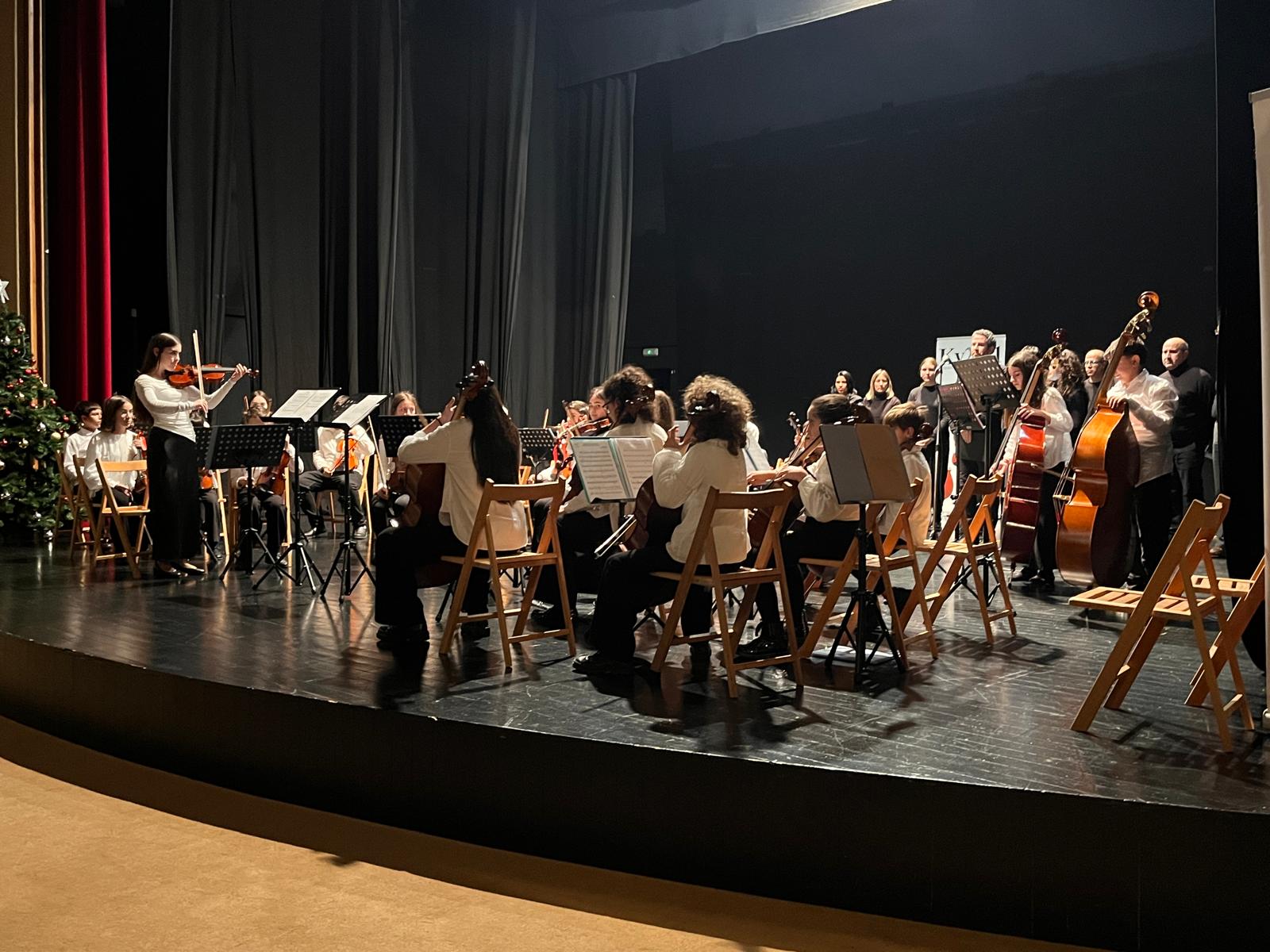 Monforte de Lemos, 4 de enero de 2025. Miembros del Equipo de Gobierno del Ayuntamiento de Monforte asistieron este sábado al Concierto de Año nuevo organizado por la Sociedad Filarmónica de Monforte con el patrocinio del Ayuntamiento. La actuación tuvo lugar en el Edificio Multiusos, a las 19.00h, y corrió a cargo de la Orquesta de cuerdas Kv2211 de Vigo, integrada por dos agrupaciones, una infantil y otra juvenil, dirigidas por Raquel Fernández y Mario Peris, respectivamente.