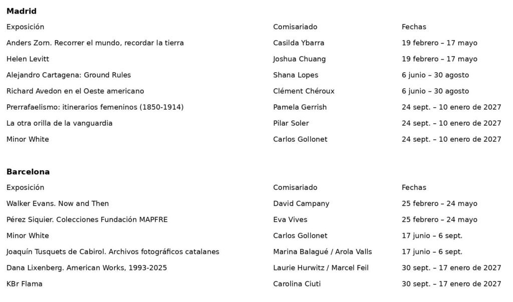 En Barcelona, el centro KBr Fundación MAPFRE desplegará una temporada centrada en la fotografía clásica, los archivos y la creación emergente. El año se abrirá con Now and Then, una revisión exhaustiva de la obra y la influencia de Walker Evans (1903–1975), acompañada de una selección de trabajos de Carlos Pérez Siquier (1930–2021), retomando una muestra interrumpida en 2020 a causa de la pandemia.