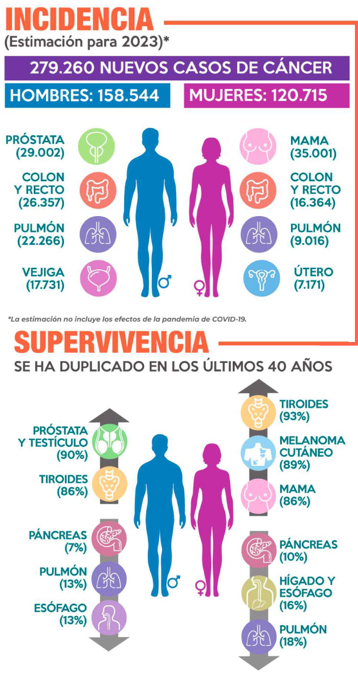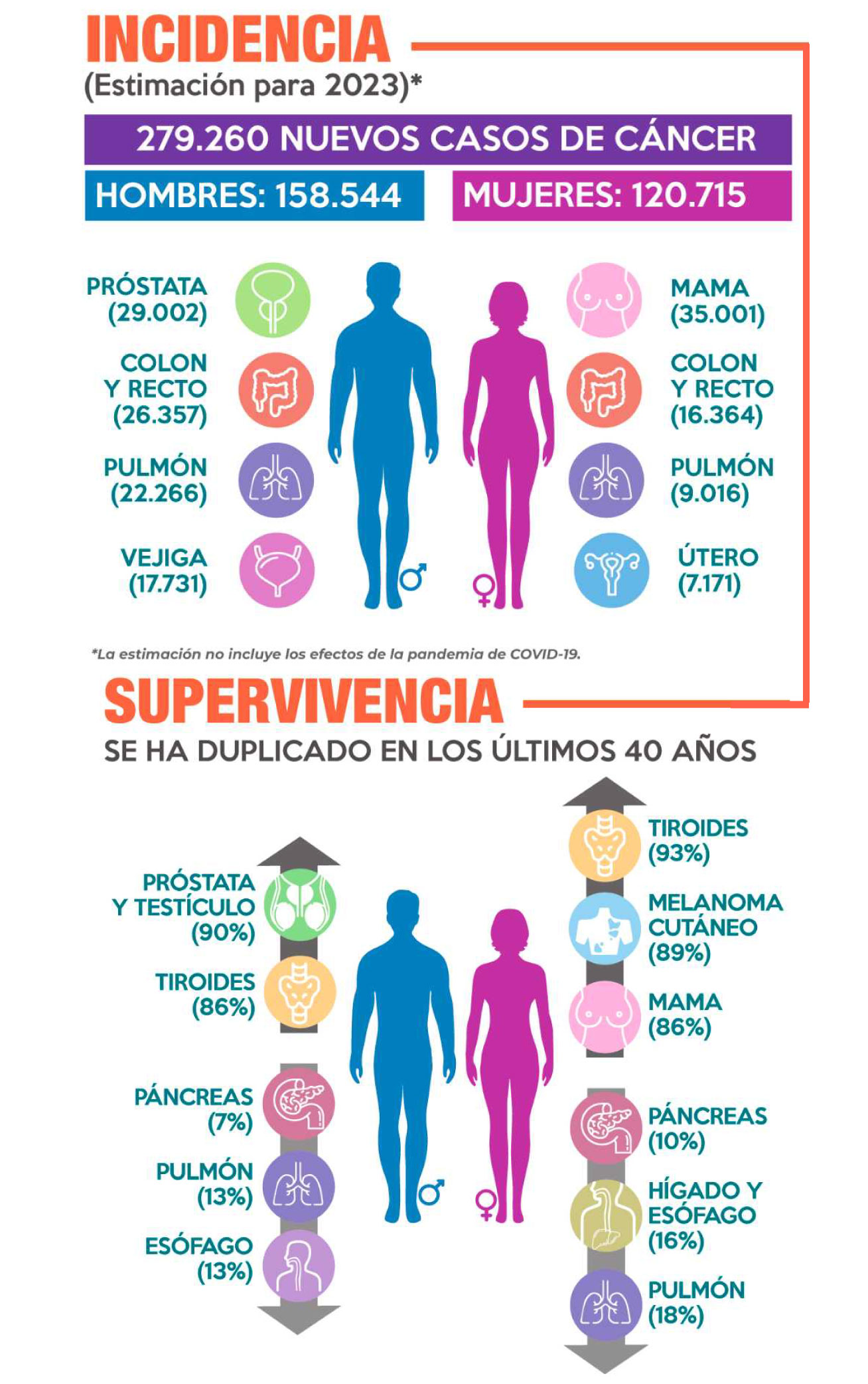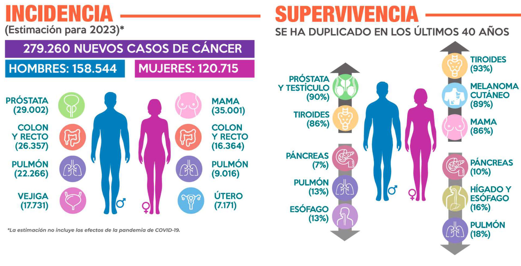 Se calcula que la supervivencia de los pacientes de cáncer en España se ha duplicado en los últimos 40 años y se prevé que continúe aumentando. En cuanto a la supervivencia neta a cinco años del diagnóstico de los pacientes diagnosticados entre 2008-2013, en España fue de 55,3% en los hombres y de 61,7% en las mujeres.