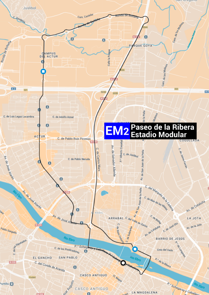 Los itinerarios de la EM2 (Paseo de la Ribera-Estadio Modular) serán, por su parte: