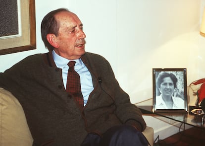El escritor Miguel Delibes celebra al haber logrado el Premio Cervantes, junto al retrato de su mujer Ángeles de Castro, en Valladolid en 1993.AGUSTÍN CACHO (EFE)