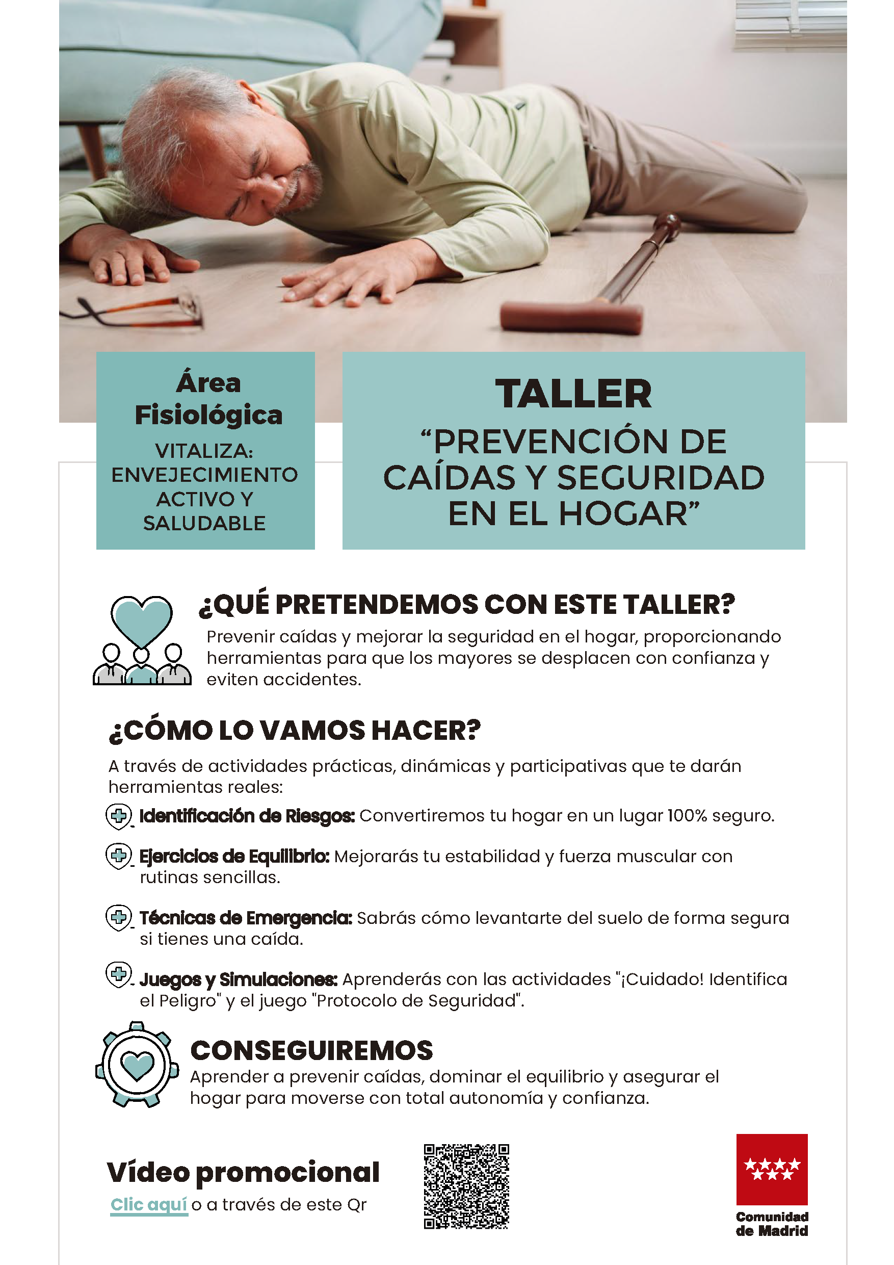 El taller tiene como objetivo principal que los mayores adquieran herramientas para evitar las caídas en casa. A través de actividades prácticas y participativas, trabajarán aspectos clave como la identificación de riesgos en el hogar, aprenderán ejercicios para mejorar el equilibrio y la fuerza y pondrán en práctica técnicas de emergencia. Los únicos requisitos para participar son: ser mayor de 60 años, querer evitar una de las principales causas de lesiones en personas mayores y querer aprender a moverse con más seguridad y confianza en su propio hogar.